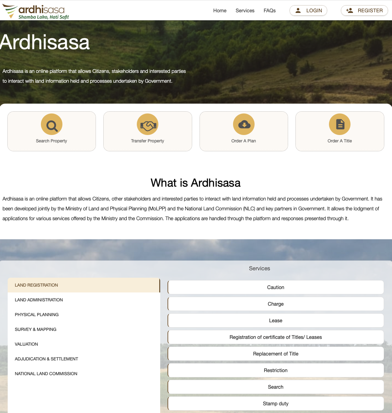 Ardhisasa (Swahili for ‘land now’) is Kenya’s official digital land registry — the National Land Information Management System (NLIMS). Launched in April 2021 for Nairobi, it’s the government’s platform for conducting land searches, registering transactions, and verifying title deed details online.