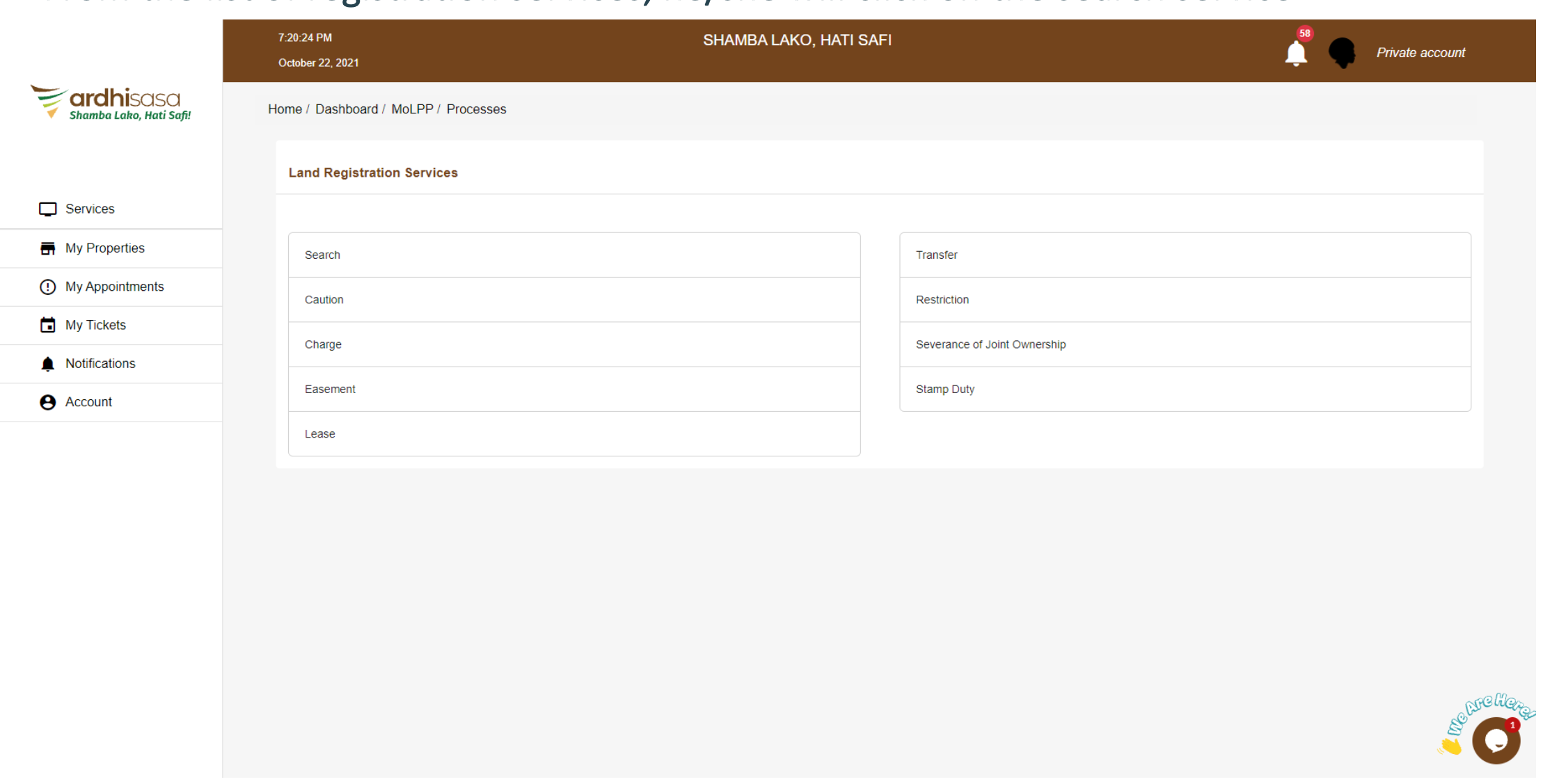 From the main dashboard, find and select the ‘Land Search’ or ‘Title Search’ option. This may appear in the navigation menu or as a prominent button on the dashboard.