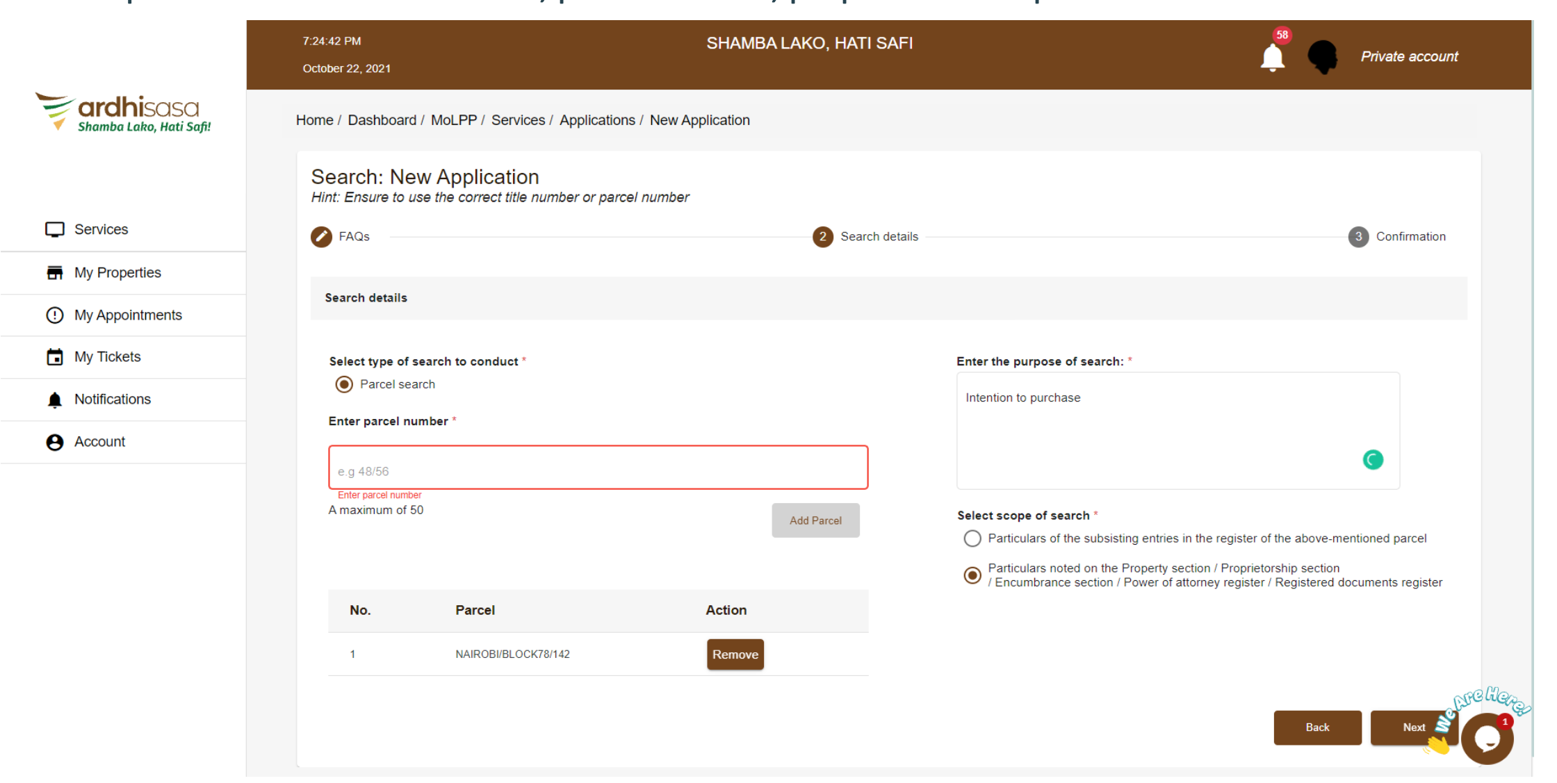 • Sectional title not found. Apartments, flats, and townhouses under sectional title are not yet in the Ardhisasa system because they lack the required geospatial data. A ‘no results’ response for a sectional property doesn’t necessarily mean fraud, but it does mean you need to verify through other channels.