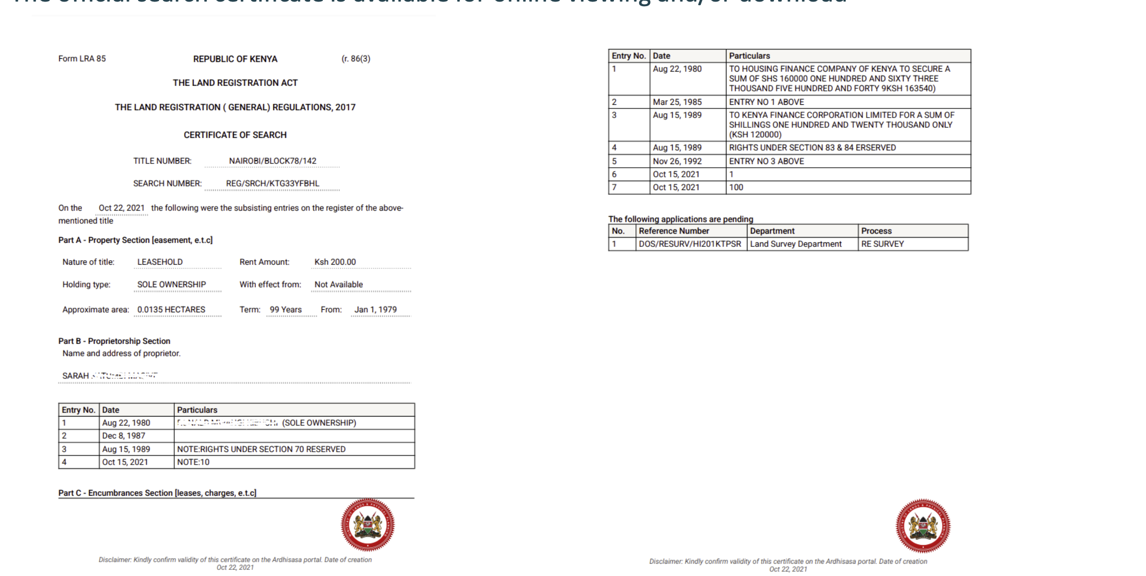 Apartments, flats, and townhouses registered under sectional title are not searchable on Ardhisasa. If you’re buying a flat in Kilimani or a townhouse in Syokimau, you’ll need to verify through a physical search at the land registry or through your lawyer.
