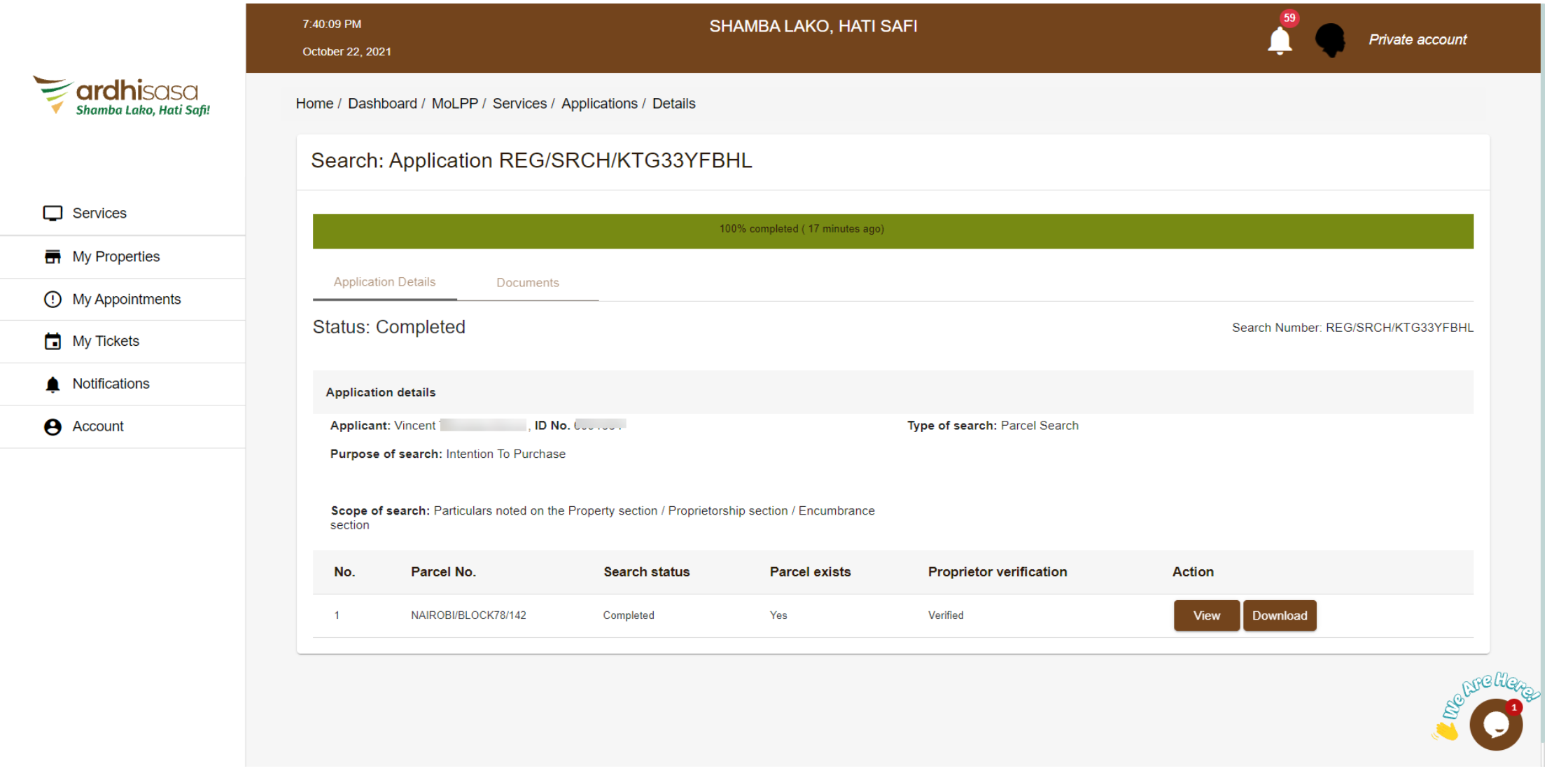 Once the owner consents, your search results will appear in your Ardhisasa dashboard. You can view them online and download a PDF copy. The results include the registered owner’s name, land reference number, plot size, any registered encumbrances (charges, caveats, loans), and the registration date.